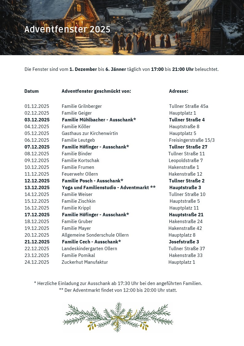 Herzliche Einladung um Adventsingen mit Liedern und besinnlichen Texten am Montag, 8. Dezember um 16 Uhr in der Pfarrkirche. Im Anschluß gibt es heiße Getränke im Kirchenpark.