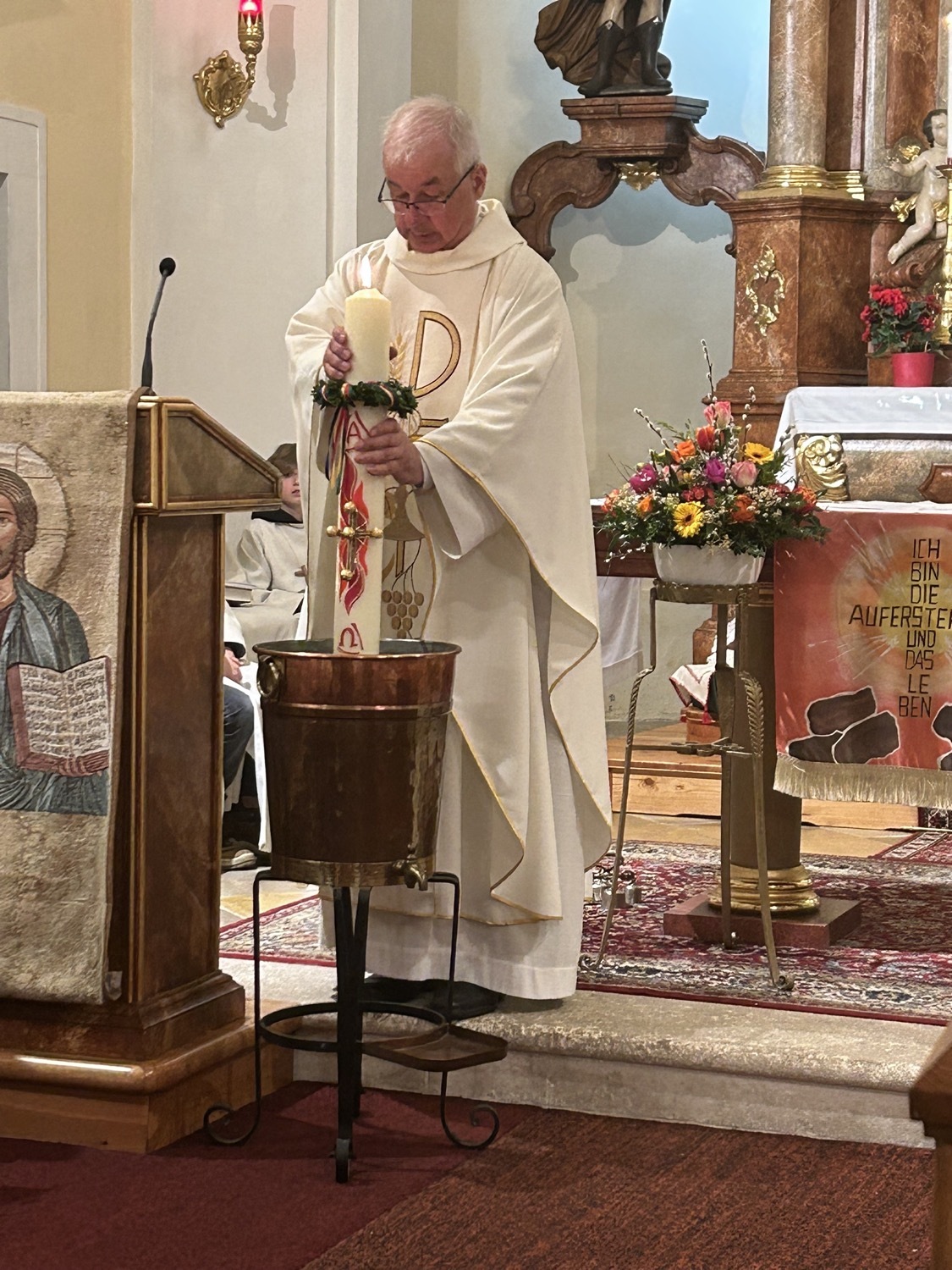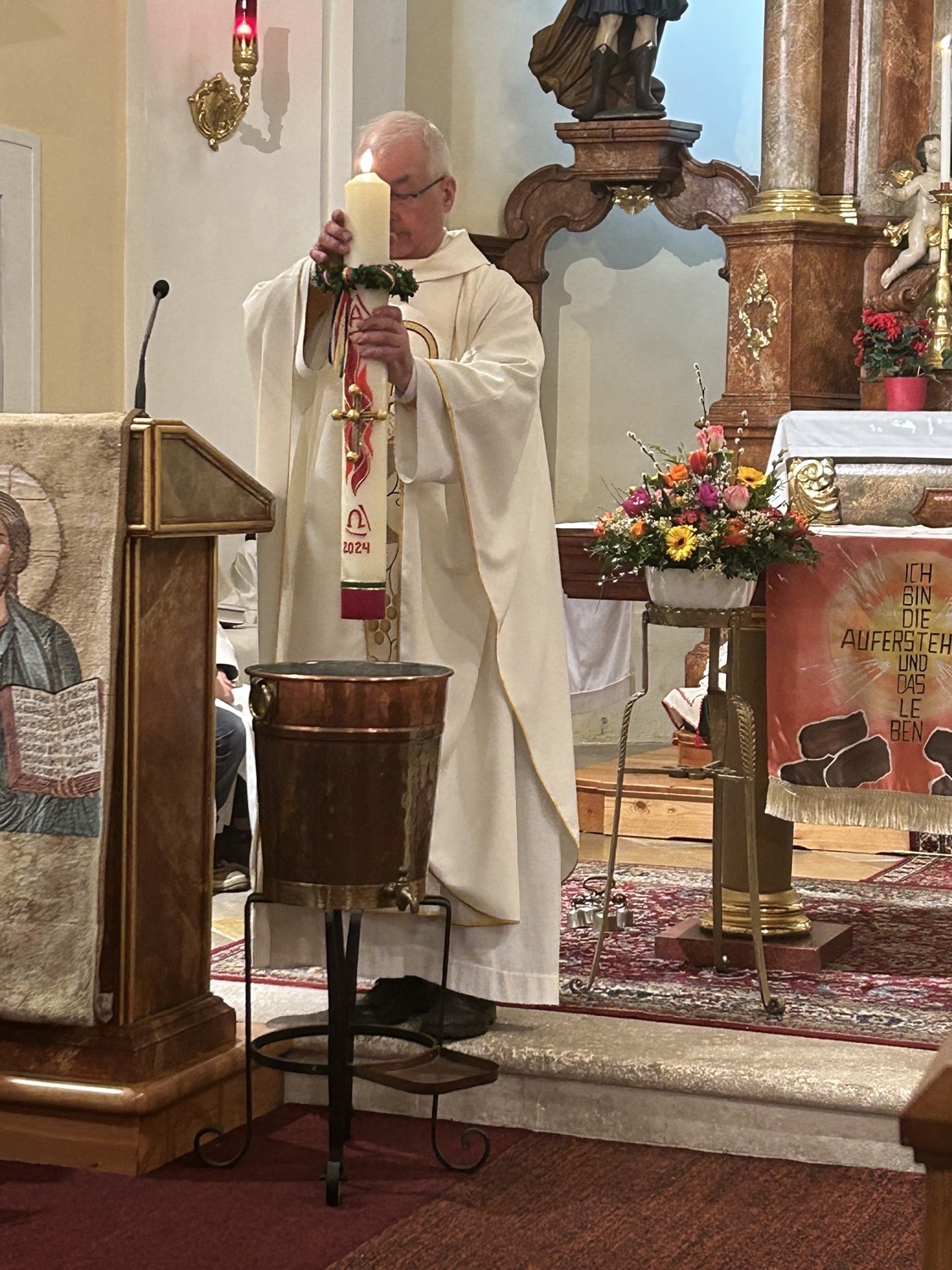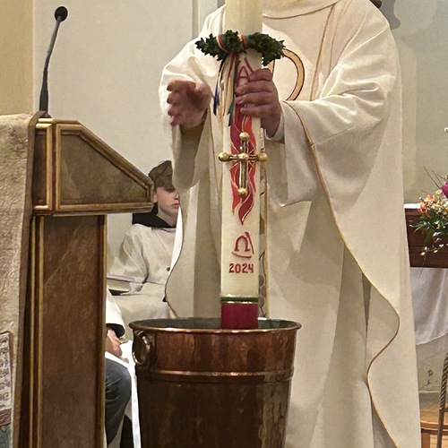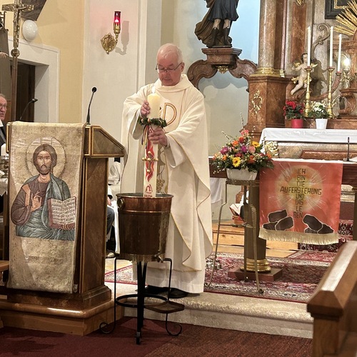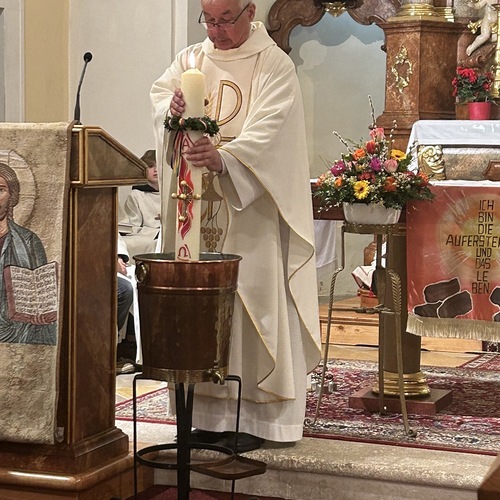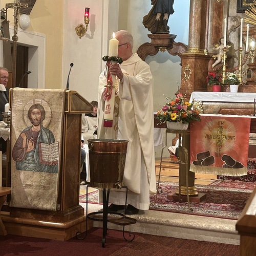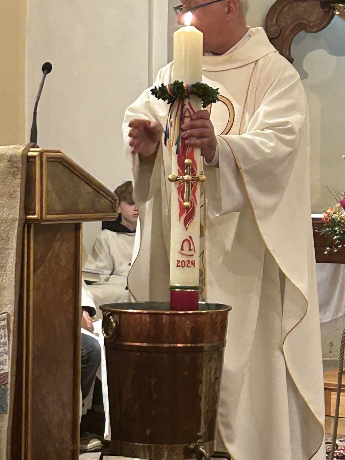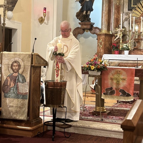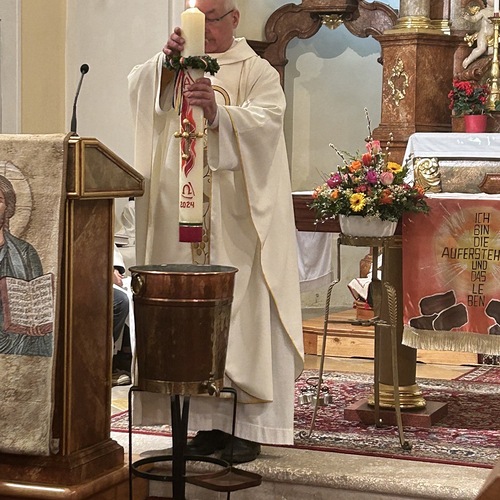 Die Osterkerze ist sodann auch für die Weihe des Wassers im Mittelpunkt, welches nun für die Taufen und Sakramente sowie für das Weihwasser das ganze Jahr über dient. Das Wasser selbst stammt aus der Quelle im Paradies bei der Klosterruine und wird vom Mesner frisch für diesen Anlass aufgefangen.