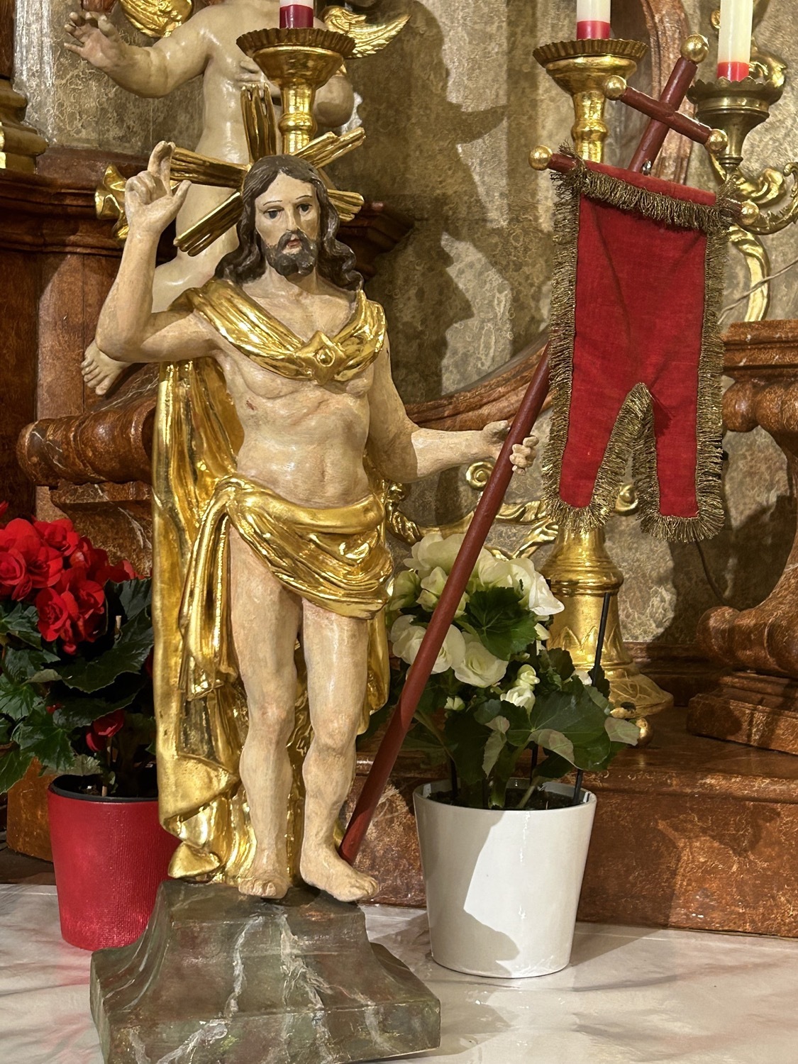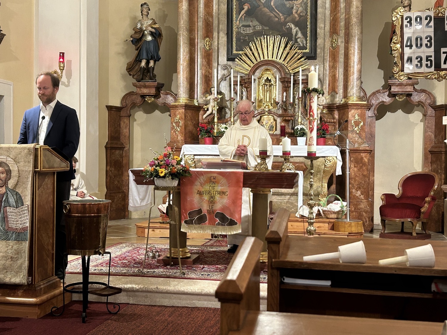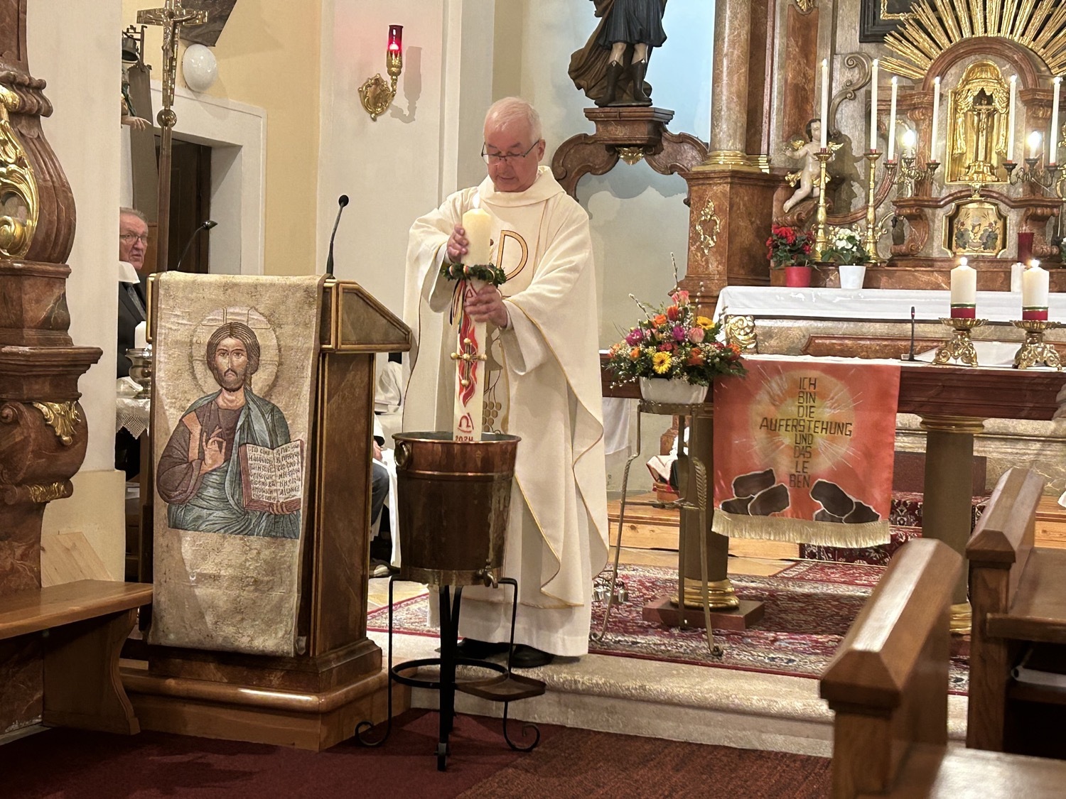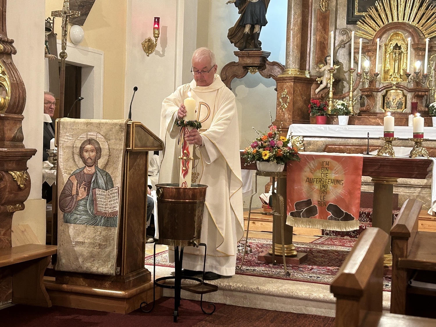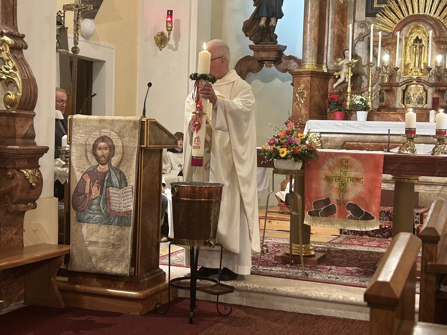 Die Osterkerze ist sodann auch für die Weihe des Wassers im Mittelpunkt, welches nun für die Taufen und Sakramente sowie für das Weihwasser das ganze Jahr über dient. Das Wasser selbst stammt aus der Quelle im Paradies bei der Klosterruine und wird vom Mesner frisch für diesen Anlass aufgefangen.