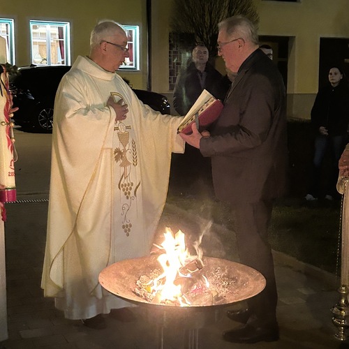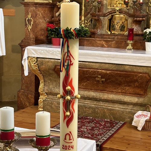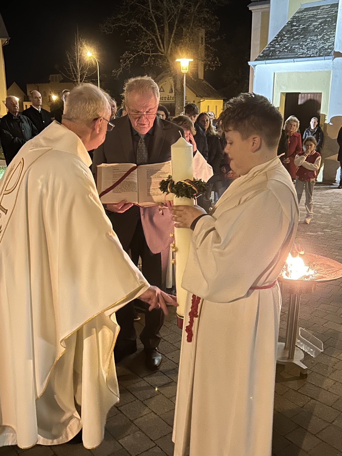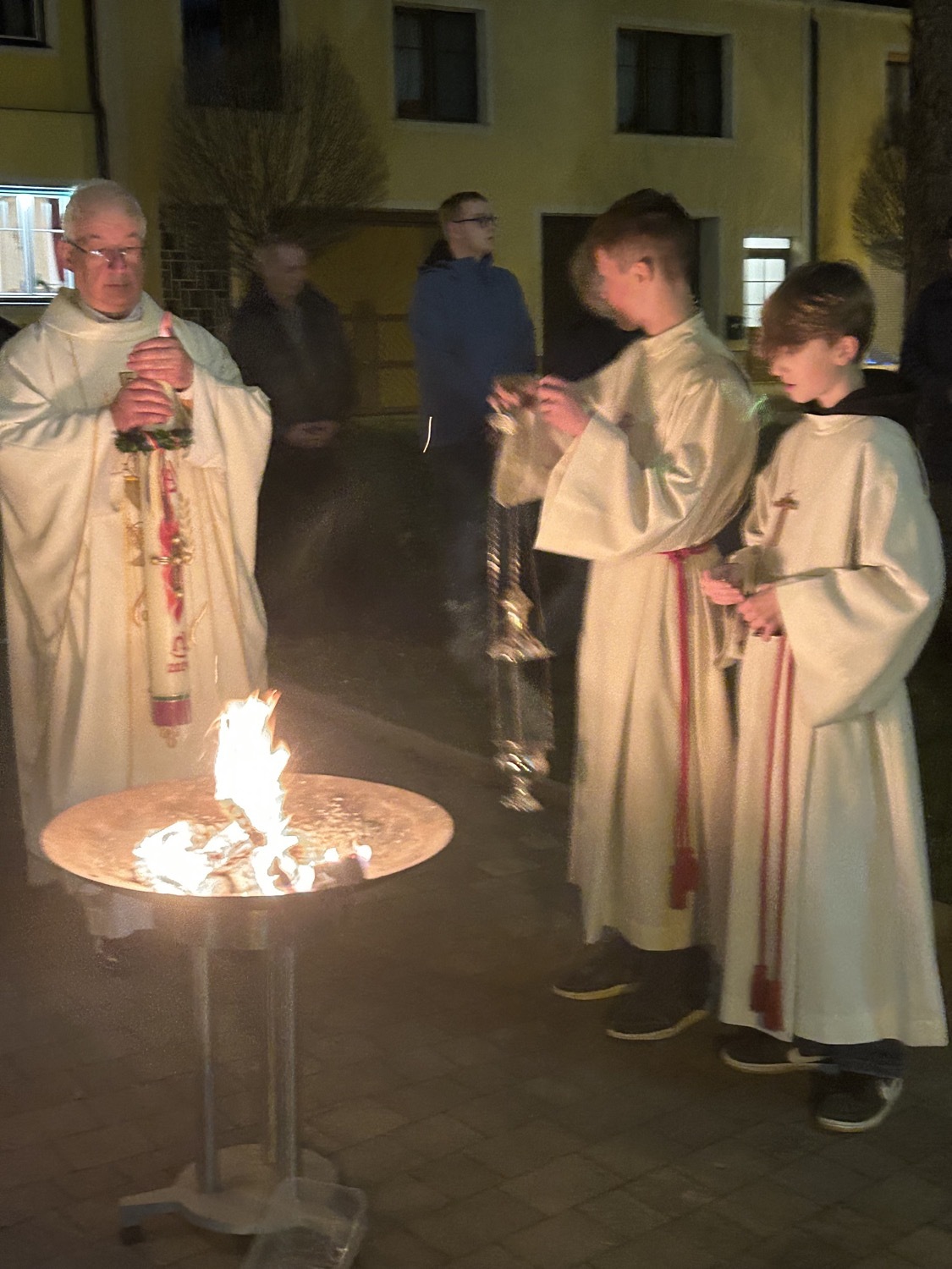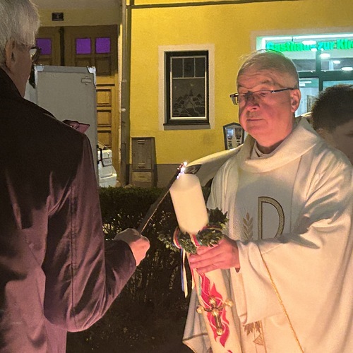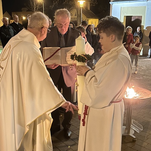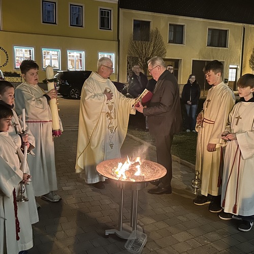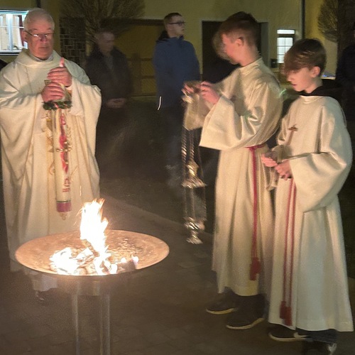 In der Dunkelheit wird am Osterfeuer die Osterkerze entzündet und die Zeichen Alpha und Omega an der Kerze angebracht. Mit der geweihten Kerze zieht der Priester in die Kirche und singt dreimal "Lumen Christi" - "Licht Christi".