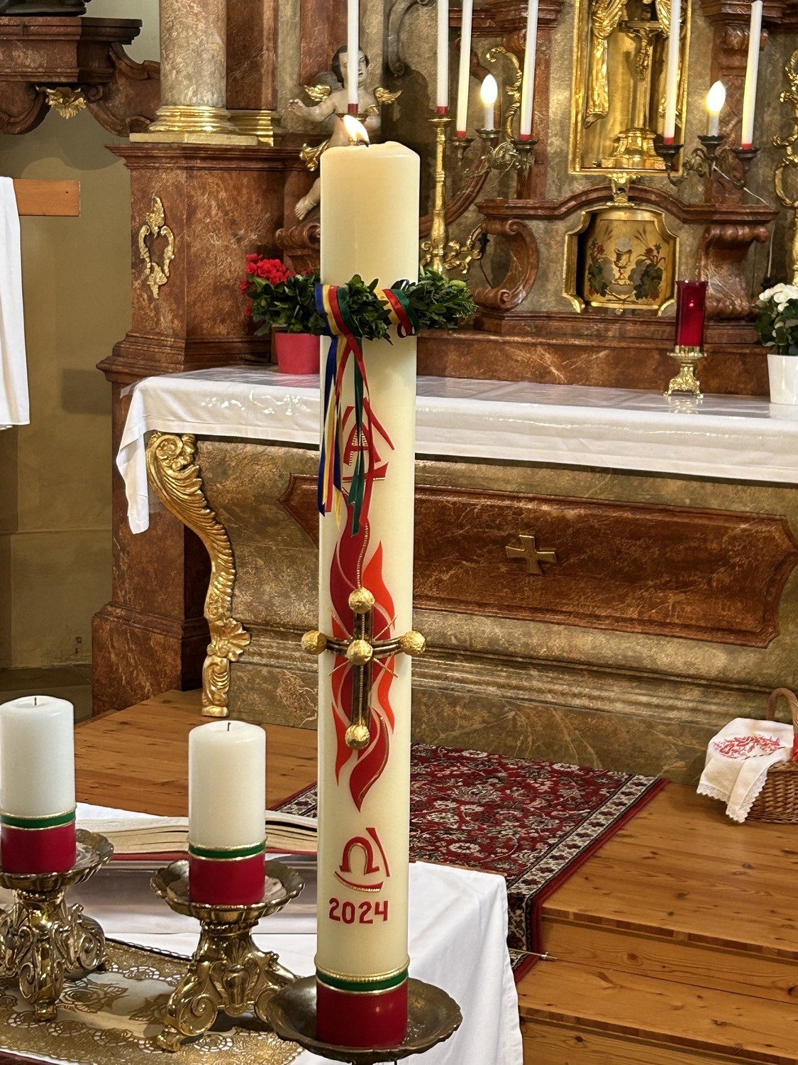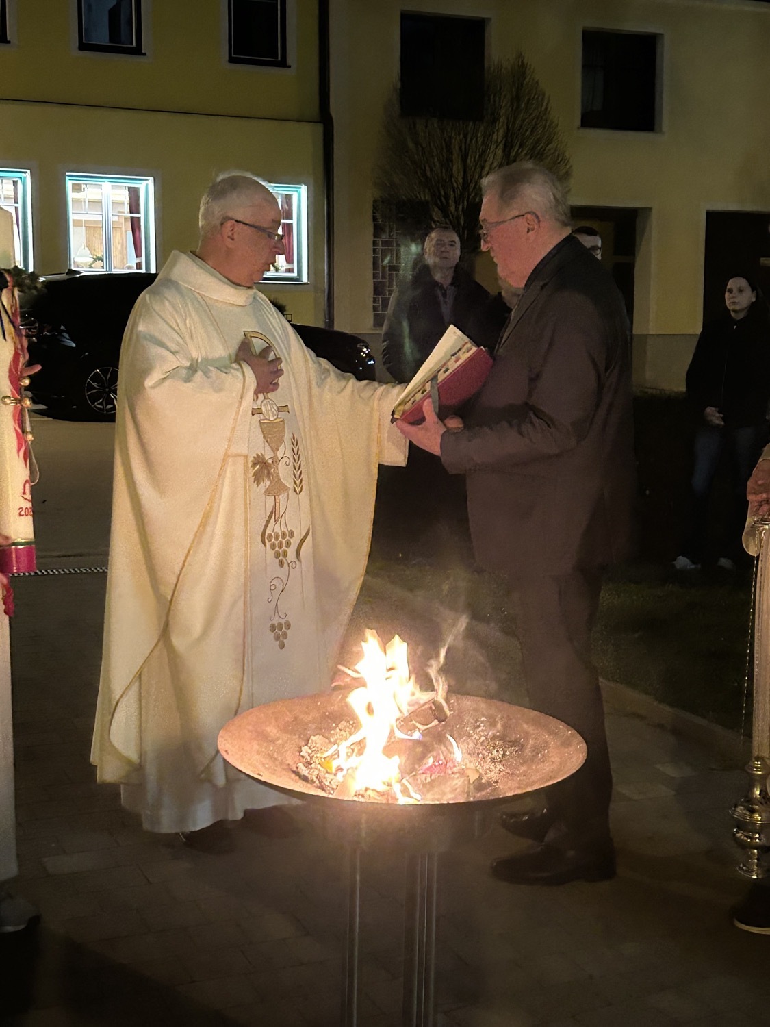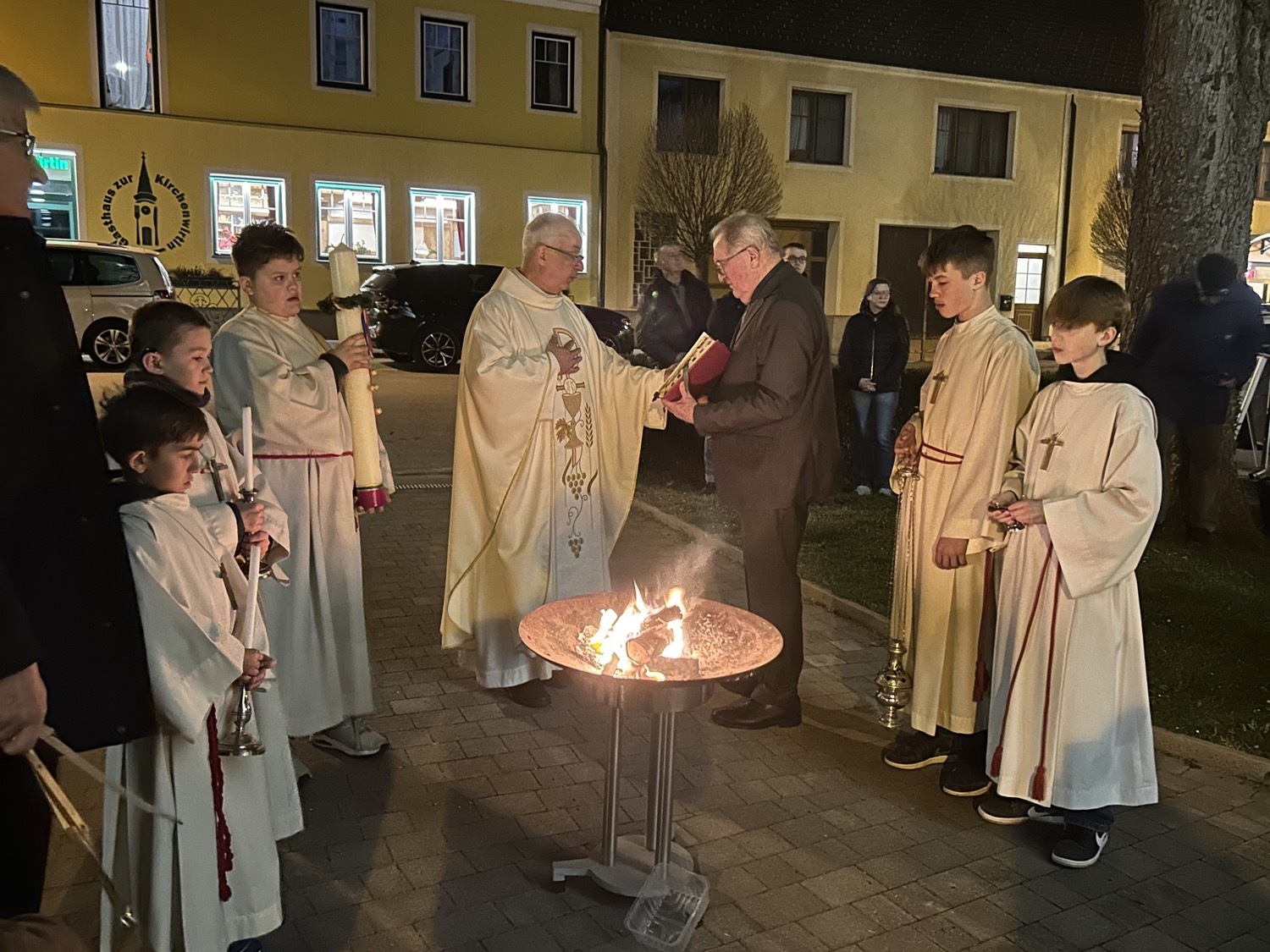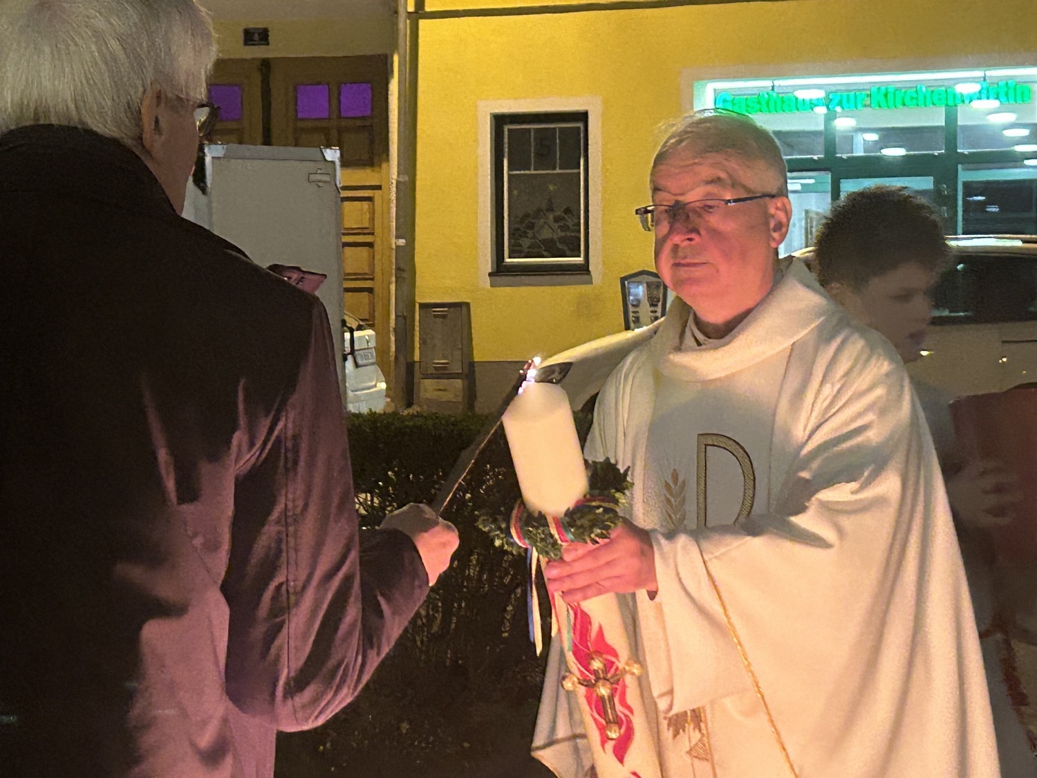 In der Dunkelheit wird am Osterfeuer die Osterkerze entzündet und die Zeichen Alpha und Omega an der Kerze angebracht. Mit der geweihten Kerze zieht der Priester in die Kirche und singt dreimal "Lumen Christi" - "Licht Christi".