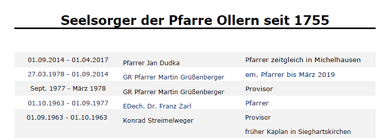 Vom 1. September 2014 bis 30. März 2017 war Pfarrer Jan zuständiger Pfarrer in Ollern. In dieser Zeit war auch Pfarrer Grüßenberger in der Seelsorge der Pfarre tätig und hat nach Möglichkeit die Gottesdienste und Andachten geleitet.