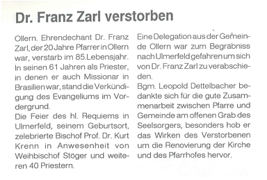 EDech. Dr. Franz Zarl war von 1. September 1963 bis 1. September 1977 Pfarrer in Ollern.